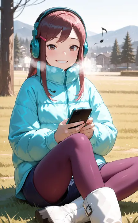 元の服装(ジャケット付き): ライトブルーのパッファー・ジャケット、ハイカラー、ジッパー、ショートパンツ、ダークネイビーのショートパンツ、パープルのタイツ、白いブーツ