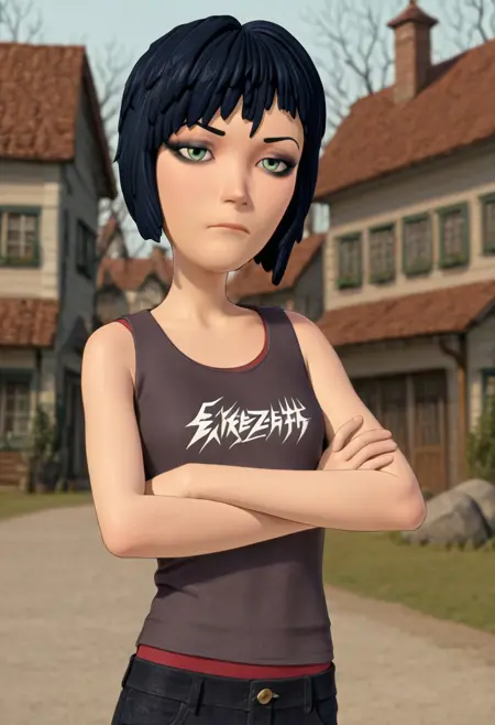 服装: 深灰色贴身背心,带有摇滚图案,内搭红色上衣,黑色紧身牛仔裤,灰色匡威帆布鞋