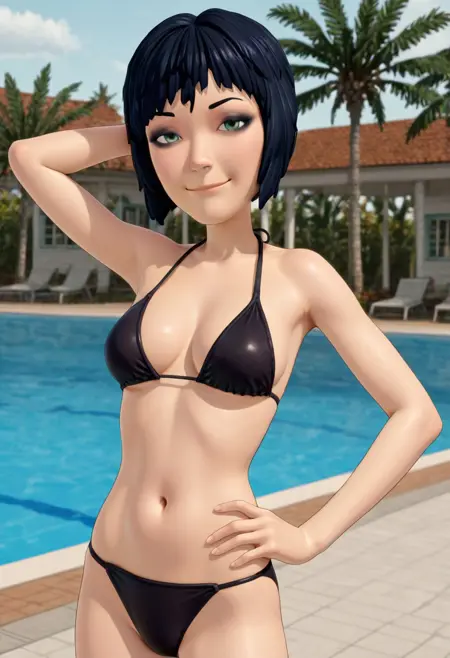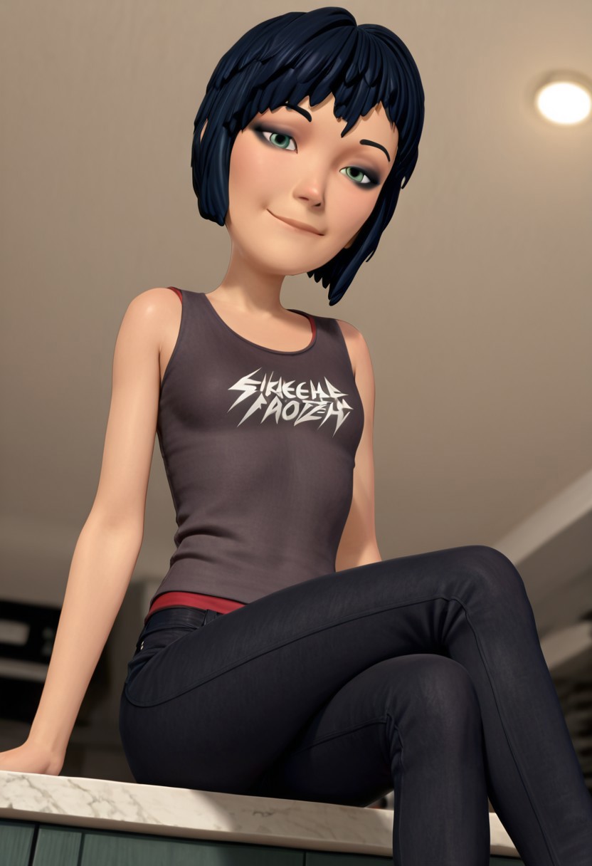1girl, solo, Elizabeth_MH, 白皙肌肤, 绿色眼睛, 不规则鲍勃头, 黑蓝色头发, 短发, 黑色眼影