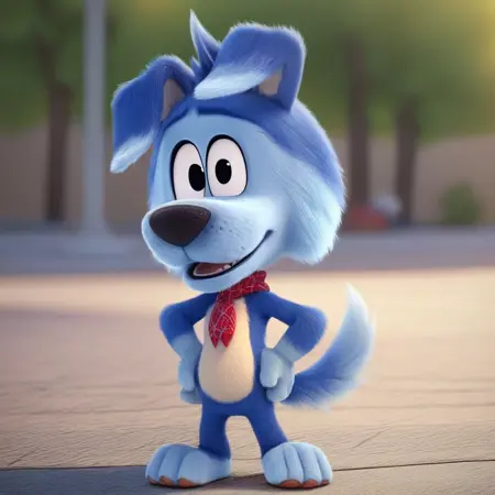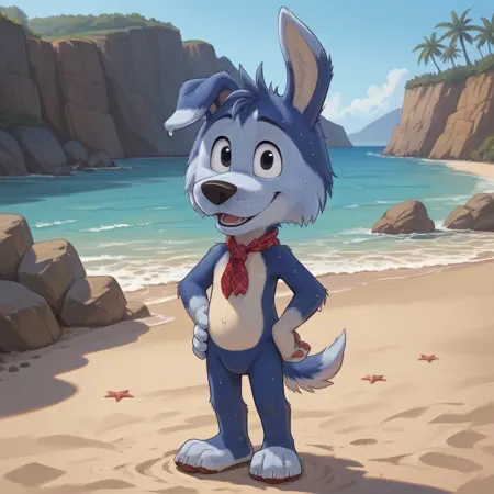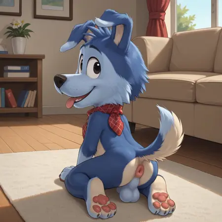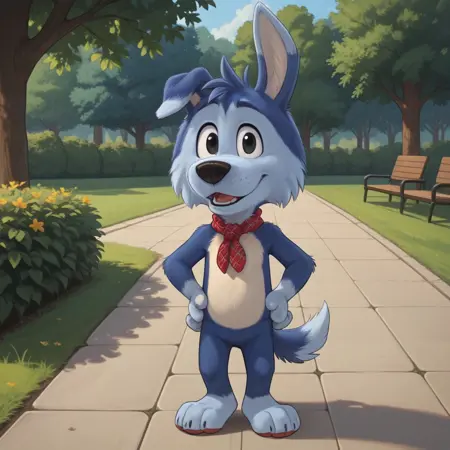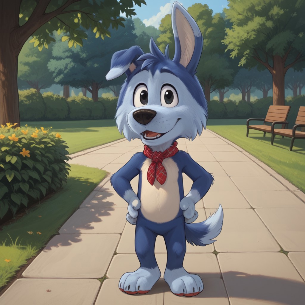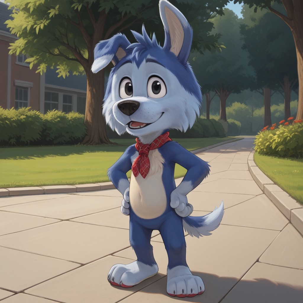 dog, dog boy, blue fur, two-toned fur, white belly fur, dog ears, dog tail, black eyes, red bandana,