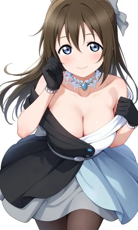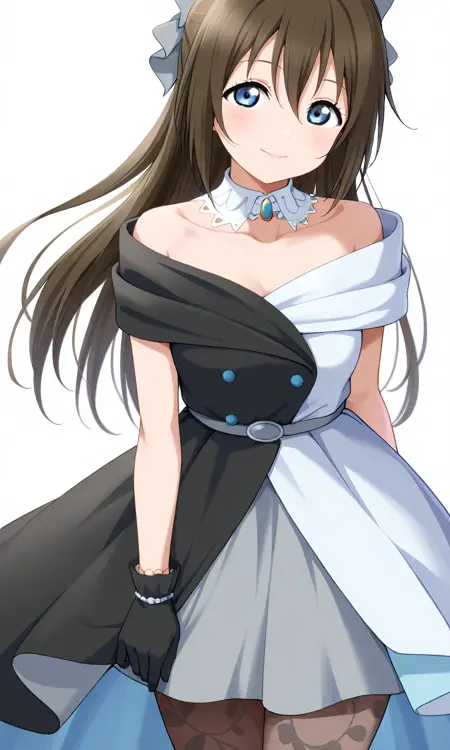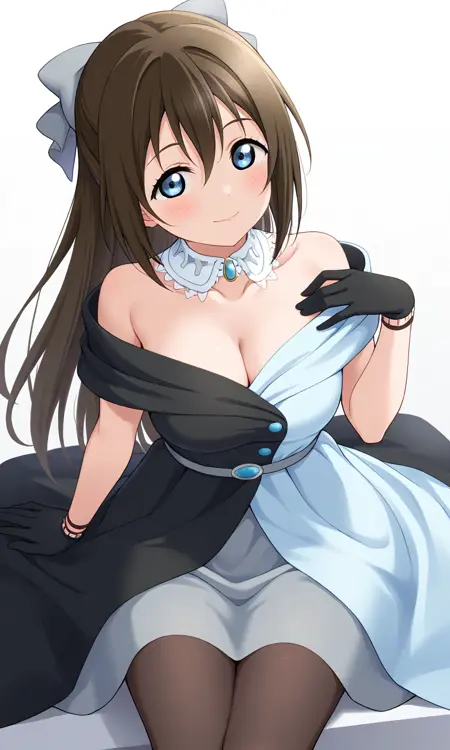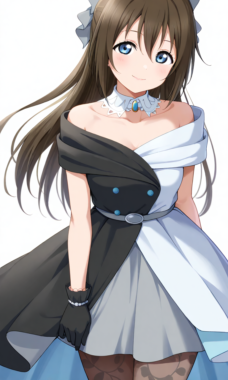 - uosaka shizuku \(love live\),solitude rain \(love_live!\),long hair,hair between eyes,blue eyes,brown hair,two-tone dress,grey bow,off shoulder,detached collar,black gloves,official alternate costume,split-color dress,pantyhose,