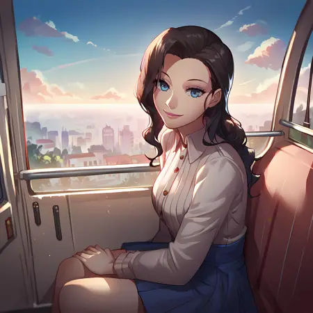 附加词:窗户、坐着、座位、窗口、摩天轮内部、模糊背景、城市景观