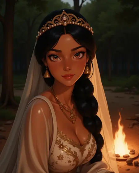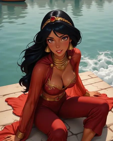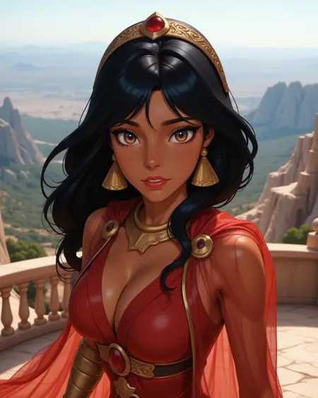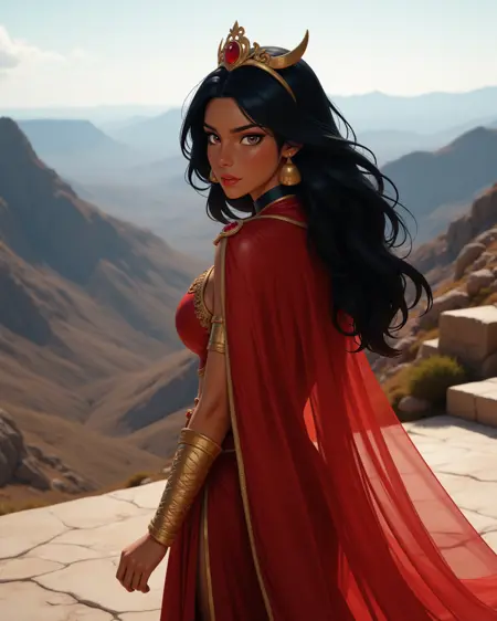 ゴールドの刺繍が施された深紅のツーピース衣装、腰に取り付けられた長い透き通った赤いキャップ、蛇の形をしたゴールドのアームバンド、ルビーがちりばめられたティアラ、冷たい大理石の上を素足で歩く