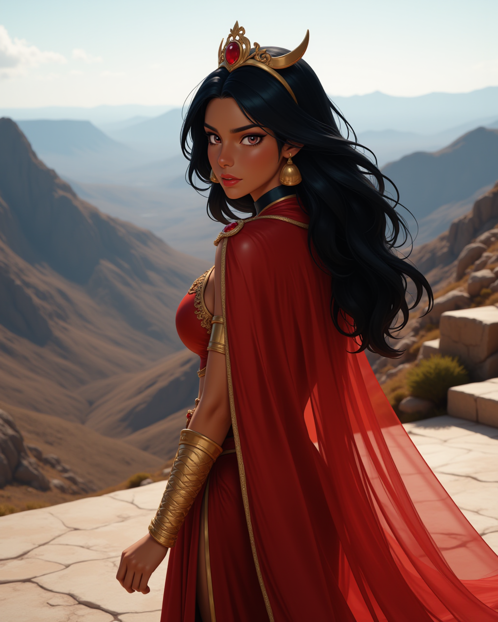 금색 자수로 장식된 진한 빨간색 두 조각 복장, 허리에 달린 긴 투명한 빨간 망토, 금색 뱀 모양 팔찌, 루비가 박힌 왕관, 발을 얼어붙은 대리석 위에 둔 상태