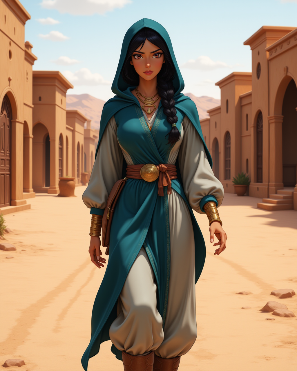 다겹으로 감싼 천 위에 사막용 진한 파란색 후ood가 달린 로브, 가벼운 하렘 바지, 갈색 가죽 부츠, 금 팔찌를 착용한 상태