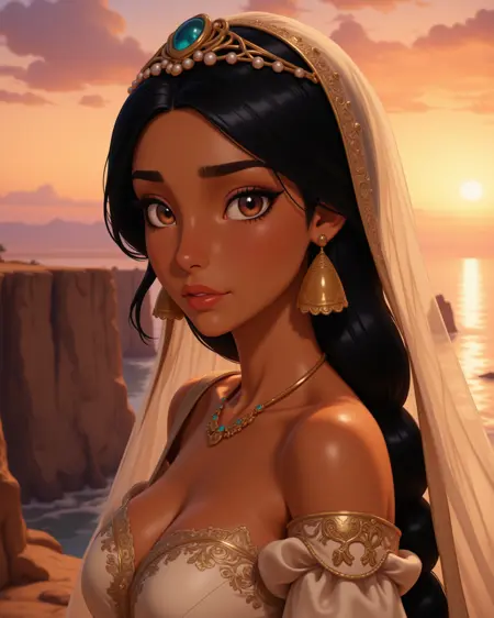 長い袖と繊細な中東風刺繍が施された、象牙色とゴールドの流れるようなブライダルドレス、背中へと垂れ下がる長い透けるベール、複雑なゴールドのティアラを着用