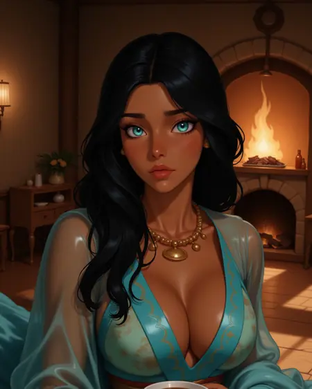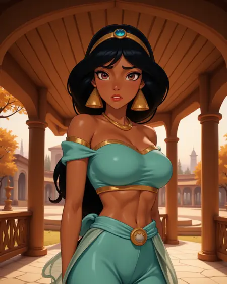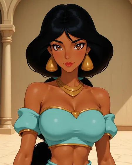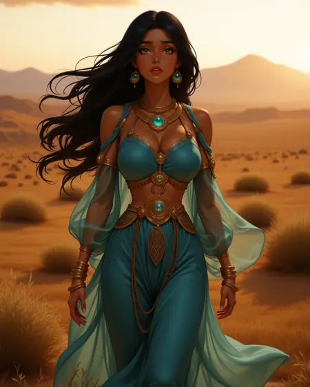 肩出しのターコイズ色のショートトップス(ゴールドのトリム付き)、マッチングするハレムズボン(透けるヒップサッシュ付き)、ゴールドのスリッパ、太いゴールドのイヤリング、宝石で飾られたヘッドバンドを着用