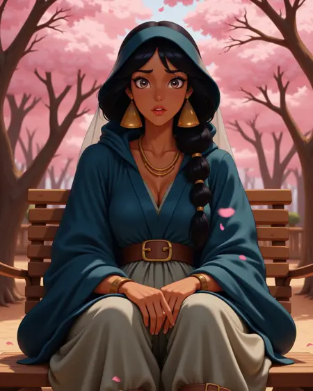 重ね着された布地の上に、深青色のフード付きローブを着用、軽量のハレムズボン、茶色のレザーブーツ、ゴールドのブレスレット