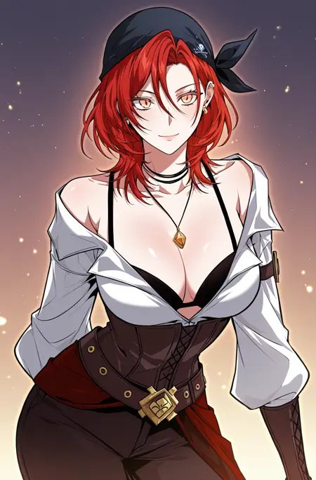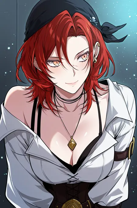 Mener, 1 girl, solo, orange eyes, red hair, medium hair, messy hair, messy bangs, hair between eyes, hair bandana, earrings, mole under eye,
