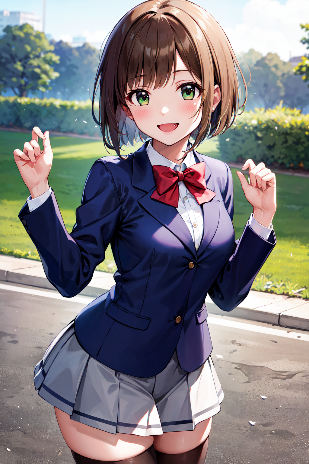 maemiku, short hair, fang, school uniform, red bow, collared shirt, blue jacket, blazer, long sleeves, pleated skirt, grey skirt, black thighhighs