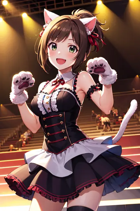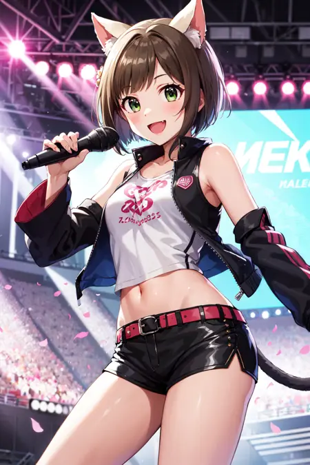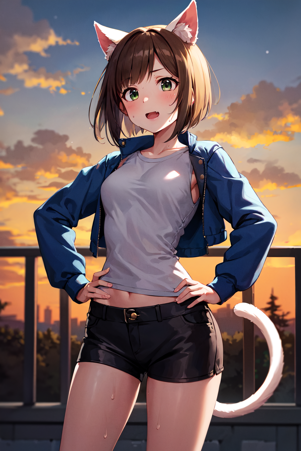 maemiku, short hair, fang, animal ears, cat tail, hair ornament, shirt, cropped jacket, sleeveless, detached sleeves, gloves, animal hands, short shorts, black shorts