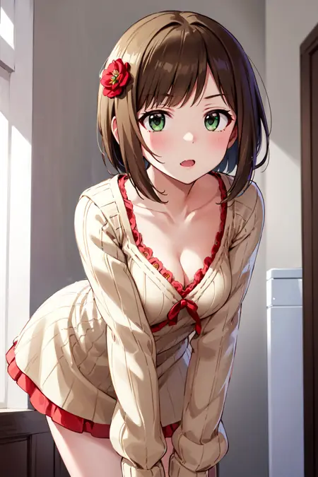 maemiku, short hair, fang, hair flower, red flower, collarbone, cleavage, sweater dress, long sleeves, sleeves past wrists