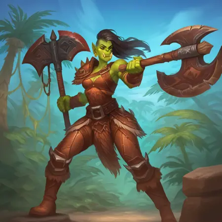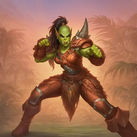 这个LoRA基于《魔兽世界》游戏《炉石传说》中兽人的艺术风格。虽然绿皮肤最常见,但你可以根据设定将皮肤颜色改为棕色或红色,或者任何你想要的颜色,哈哈。它被设计为一种风格,因此可以与其他LoRA搭配使用。