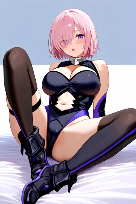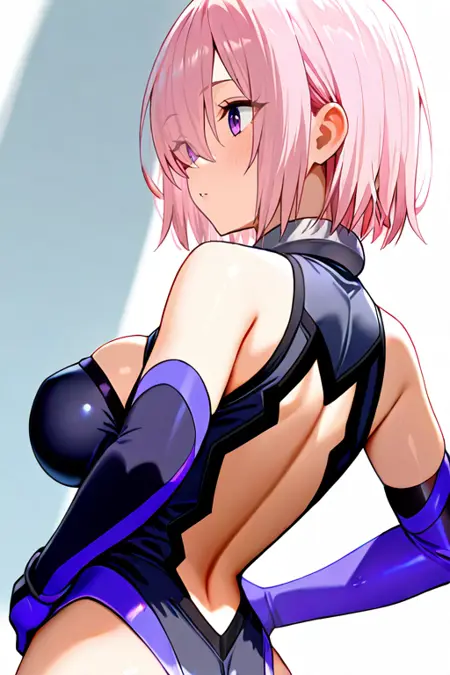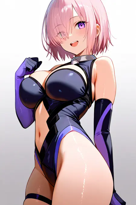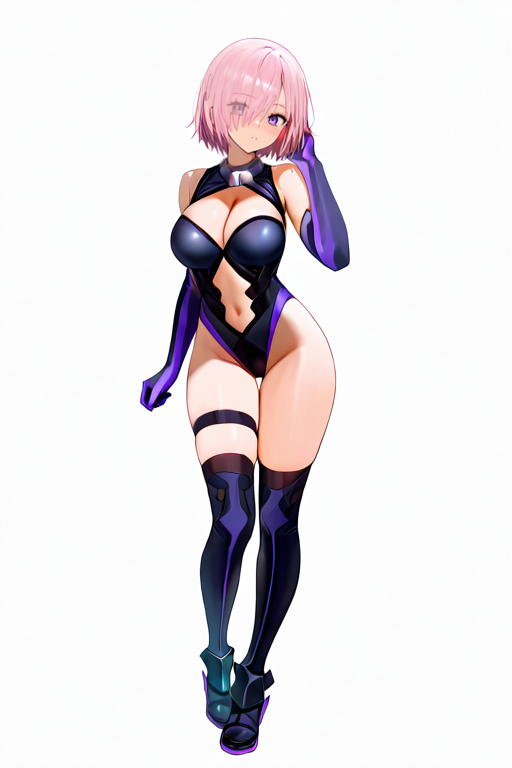 大きな胸, mashdef, 肩を露出, 黒のレオタード, 衣装の切り抜き, 胸元の切り抜き, おへその切り抜き, 背中の切り抜き, 股間, 肘までの手袋, 紫の手袋, 大腿ストラップ, 黒の太ももまでの靴下, 黒の靴