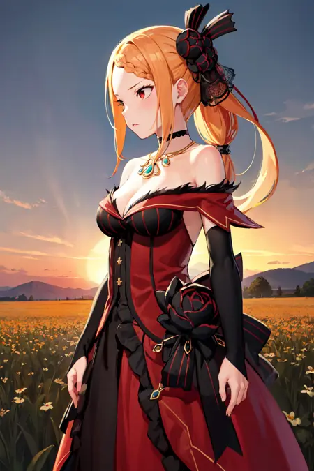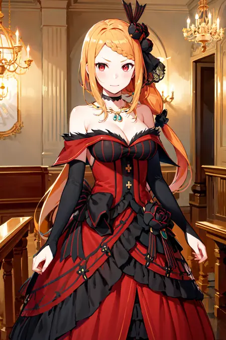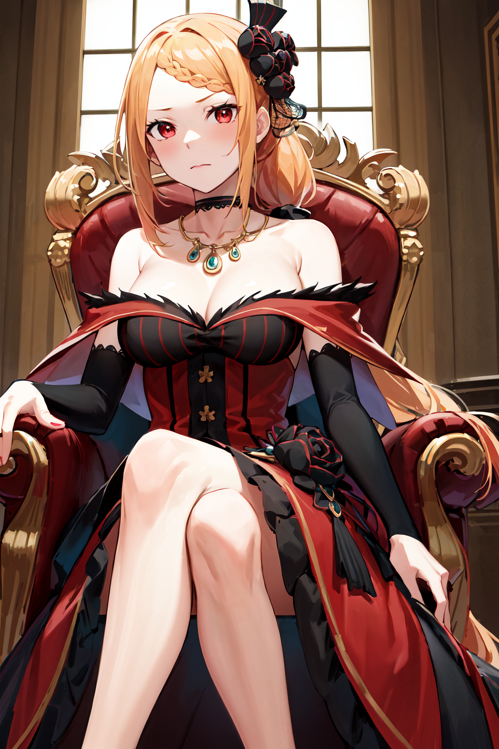 outfit1hmpris, long hair, braided bangs, low ponytail, hair ornament, choker, collarbone, necklace, cleavage, bare shoulders, red dress, detached sleeves, black sleeves
