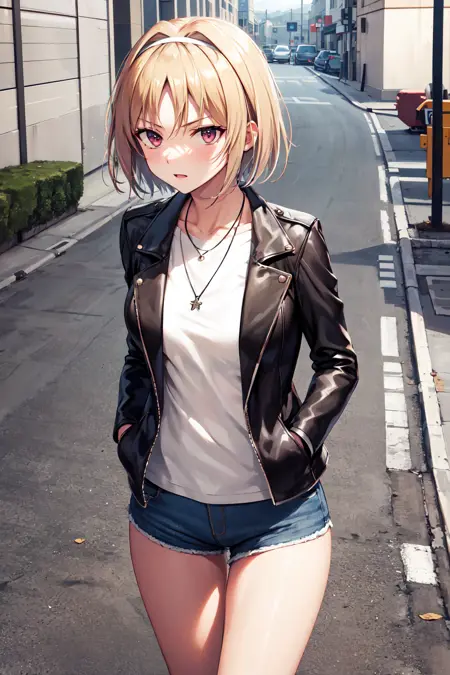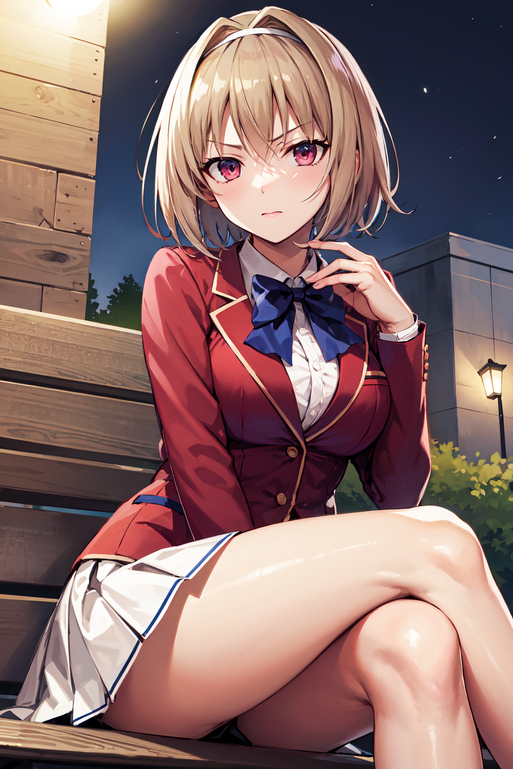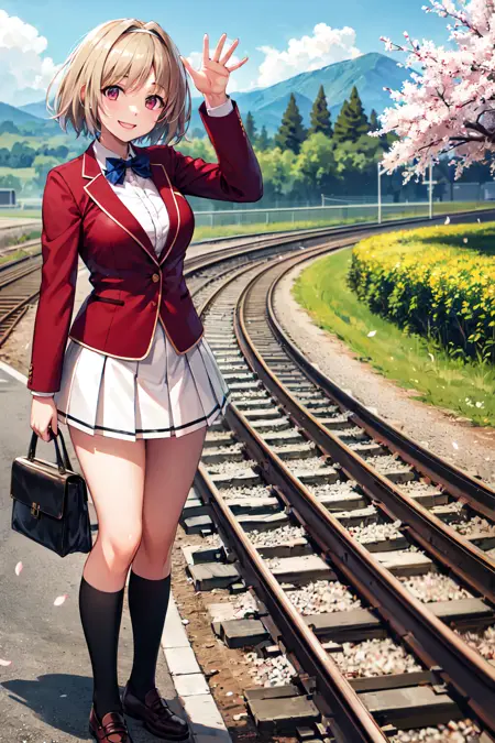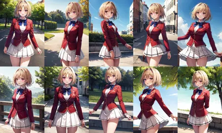 outfit1aakikyo, short hair, hair intakes, white hairband, blue bowtie, shirt, blazer, red jacket, long sleeves, white skirt, pleated skirt, black socks