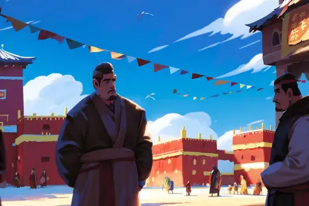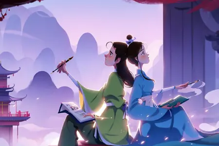ポジティブキーワードの例:イラスト、手描きテクスチャー、中国伝統絵画、複数の少年、長髪、鳥、黒髪、長袖、旗
