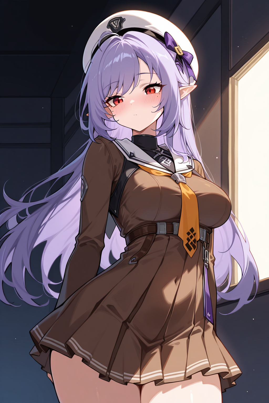 갈색 드레스, 해적 복장, 해적 목걸이, 주름진 드레스, 치마, 해적 모자, 목수건, vivianzzzduck, zenless zone zero, 뾰족한 귀, 보라색 머리, 붉은 눈, 긴 머리, 눈 밑 점, 중간 정도의 가슴, 볼빨간색,
