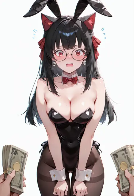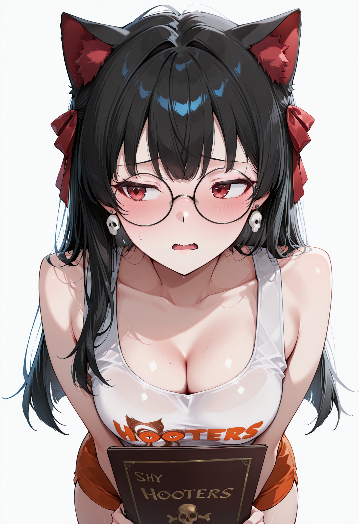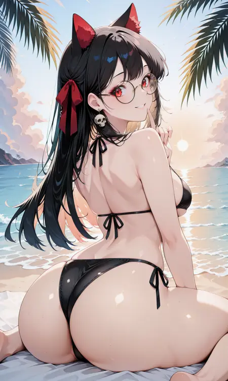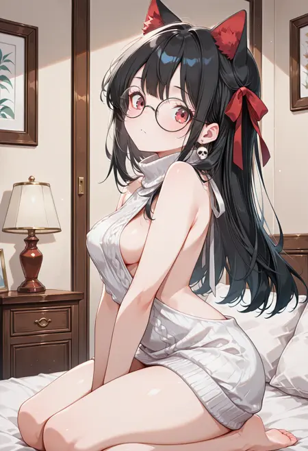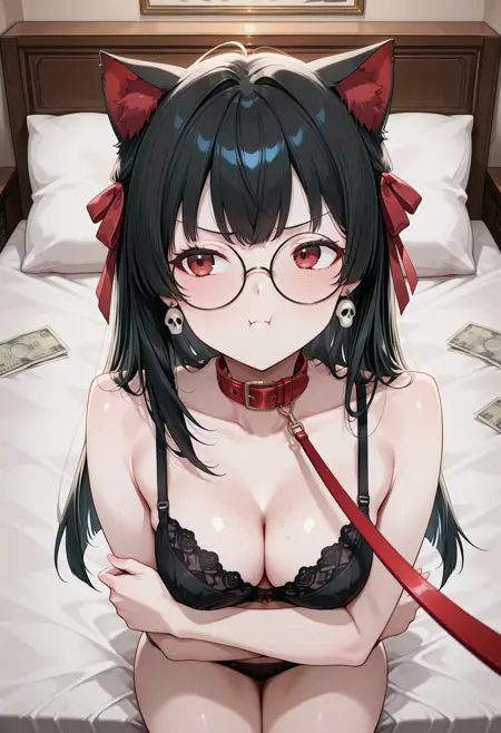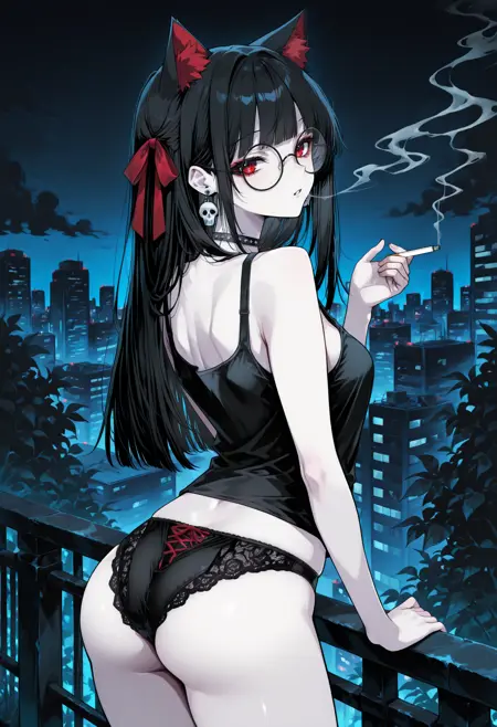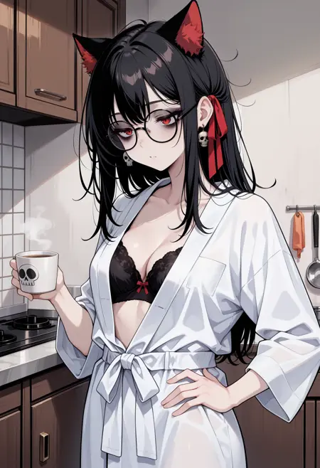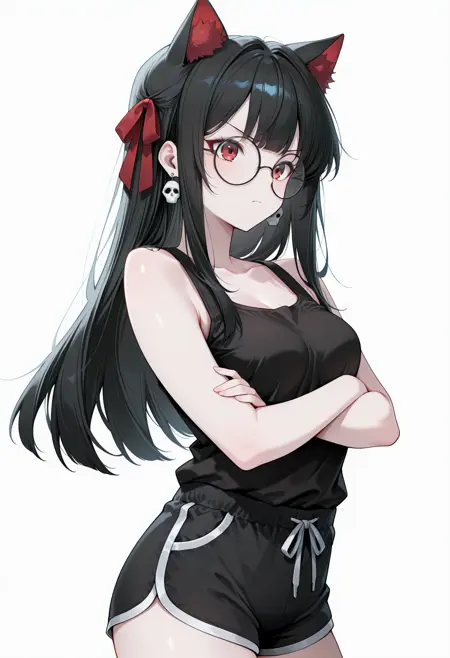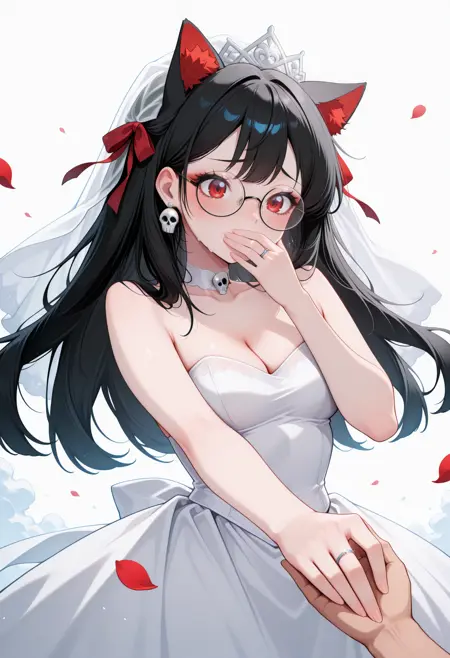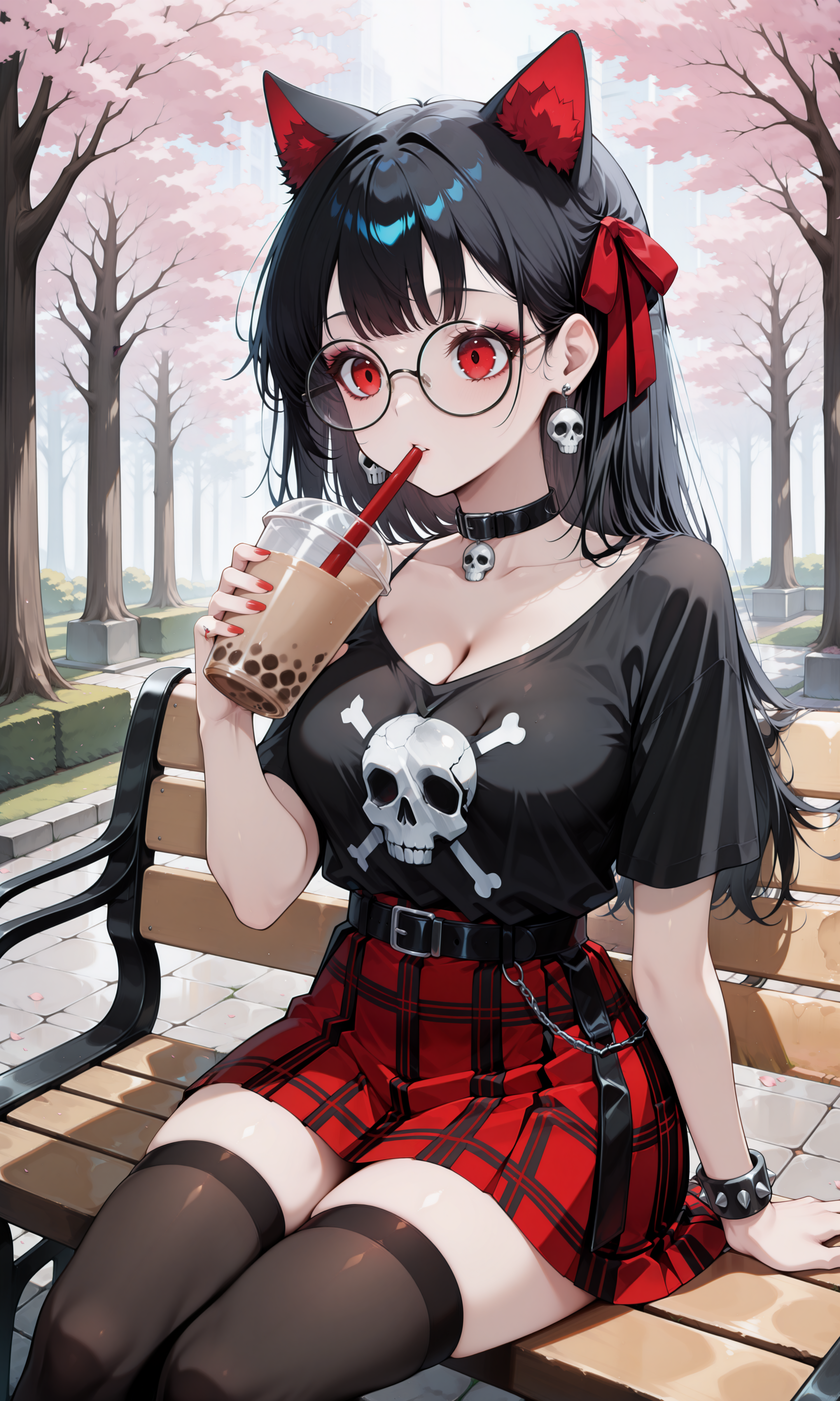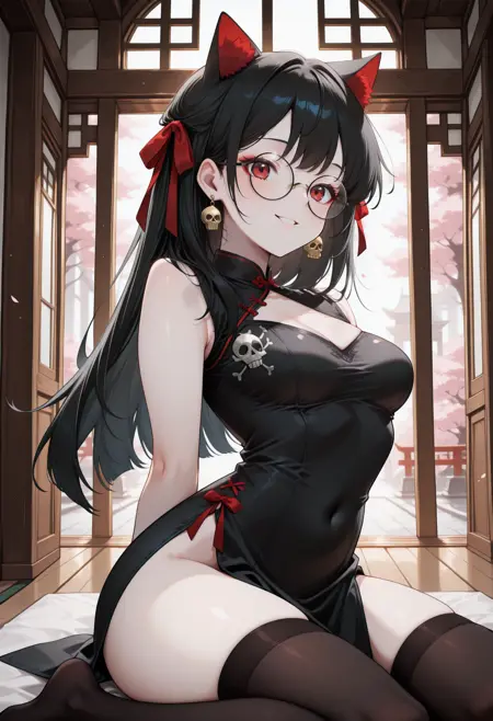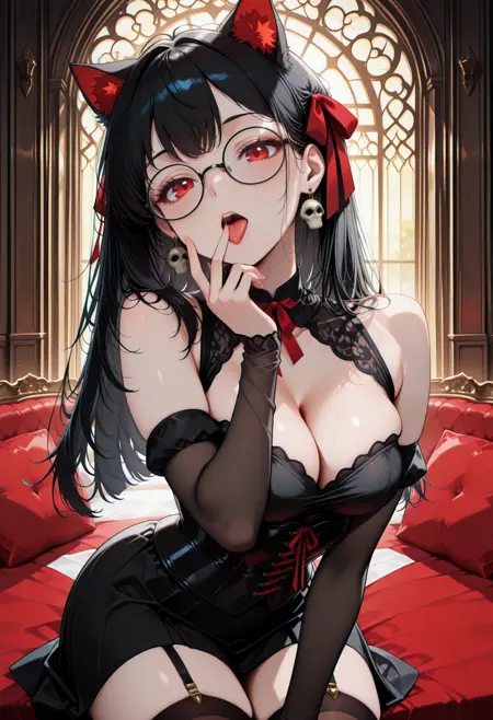 rvnn, 红色眼睛, 动物耳朵, 动物耳绒毛, 红色耳绒毛, 黑发, 长发, 红色丝带, 发带, (骷髅耳环:0.8), 圆形眼镜