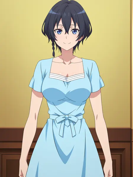 1girl, short hair, blue eyes, black hair, hair between eyes, side braid, kohiruimaki_karen