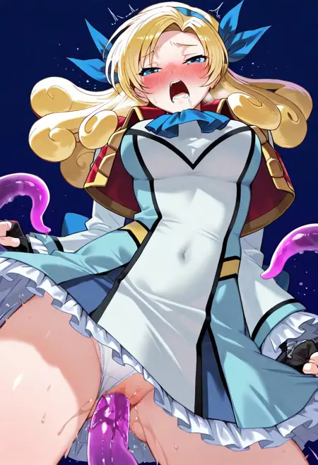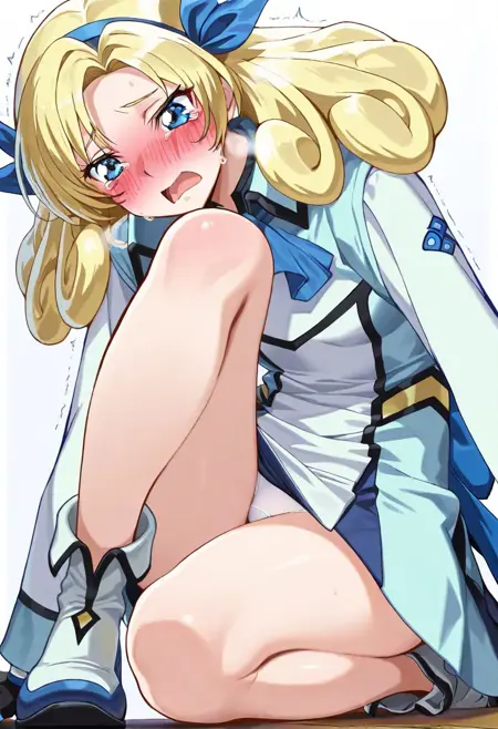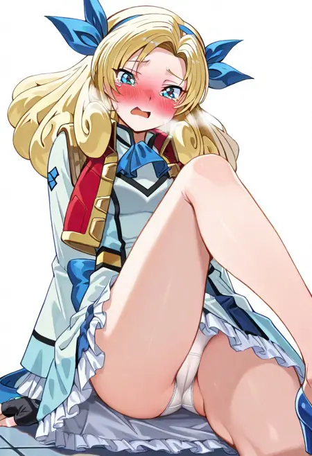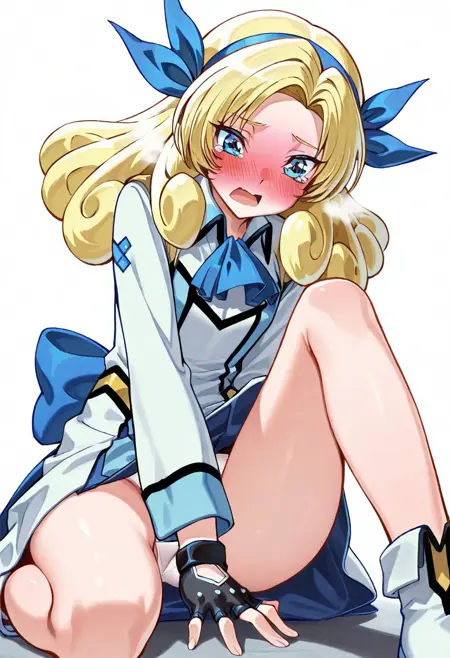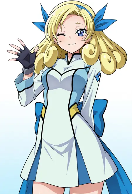1girl, solo, AllouPom, 金发, 蓝眼, 蓝色发带, 蓝色发丝缎带, 蓝色领结, 长发, 额头, 上扬的刘海, 卷发, 中等胸部