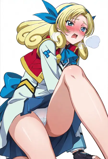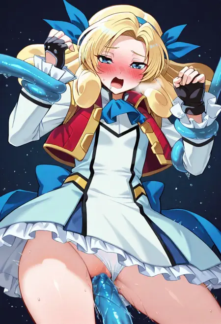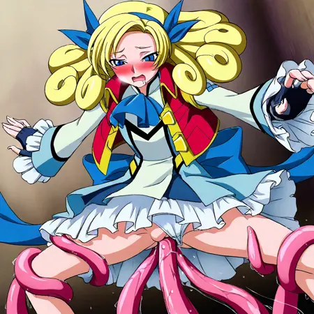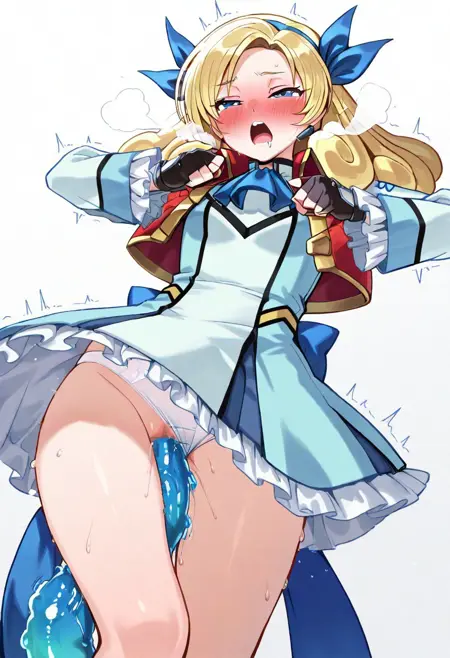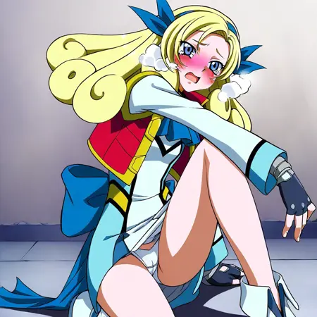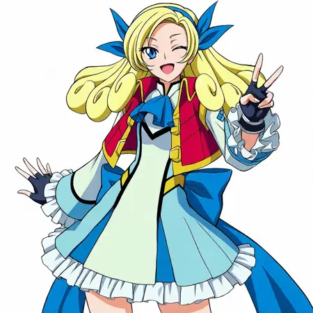 红色短款夹克,金色镶边,白色与蓝色连衣裙,黄色点缀,荷叶边袖子,荷叶边连衣裙,层叠裙摆,背部蓝色蝴蝶结,赤腿,无指手套