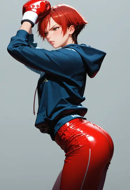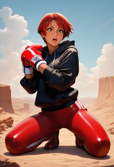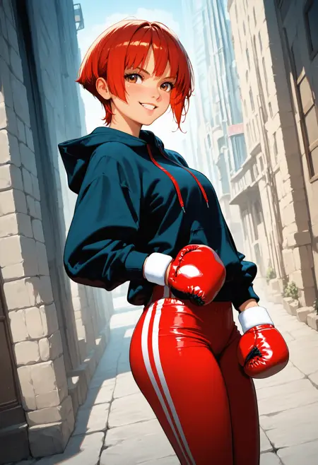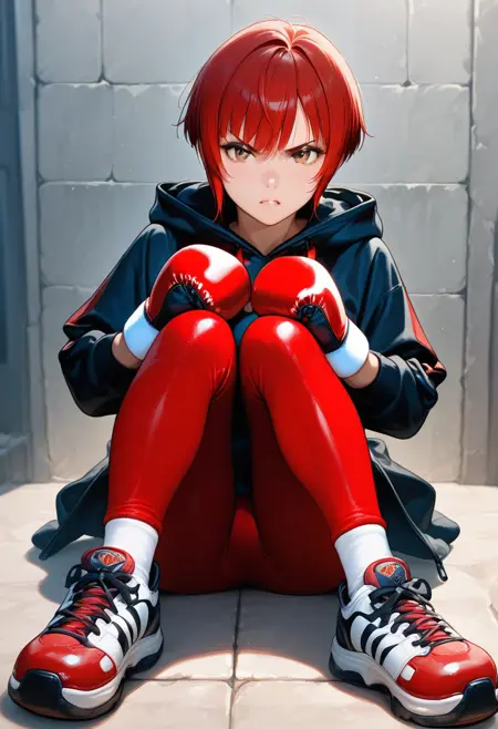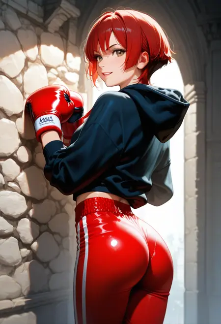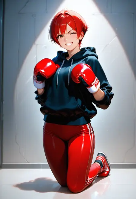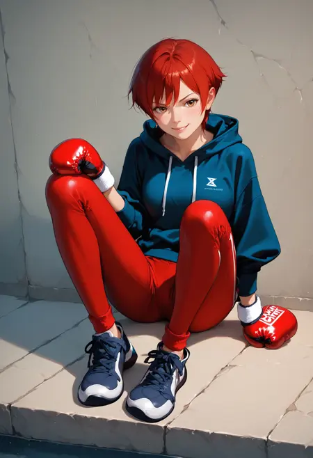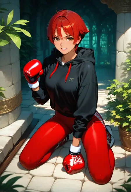 adri1n1thebox3r, 1girl, short hair, hood, red hair, pants, hoodie, brown eyes, red pants, boxing gloves [ your prompt ]