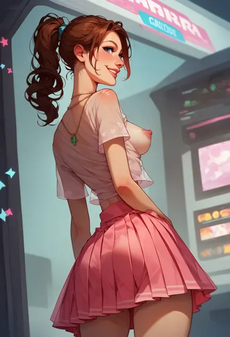 [镜头类型:背面、正面、上方、下方] mia-rose, 1girl, solo, 裙子, 棕发, 乳房, 微笑, 乳头, 透明, 马尾辫, 粉色裙子, 百褶裙, 蓝眼睛, 遮盖乳头, 透明衬衫, 项链 [ 你的提示:场景和她的动作] 为必需触发词。