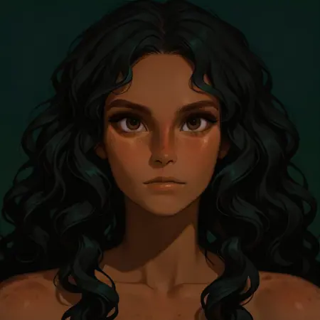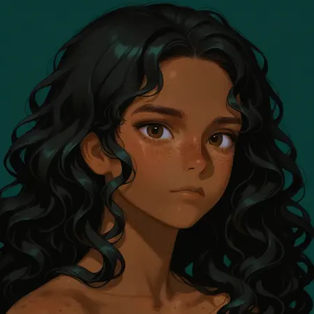 black_hair, brown_eyes, freckles, wavy_hair, long_hair