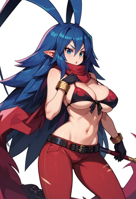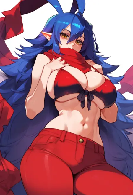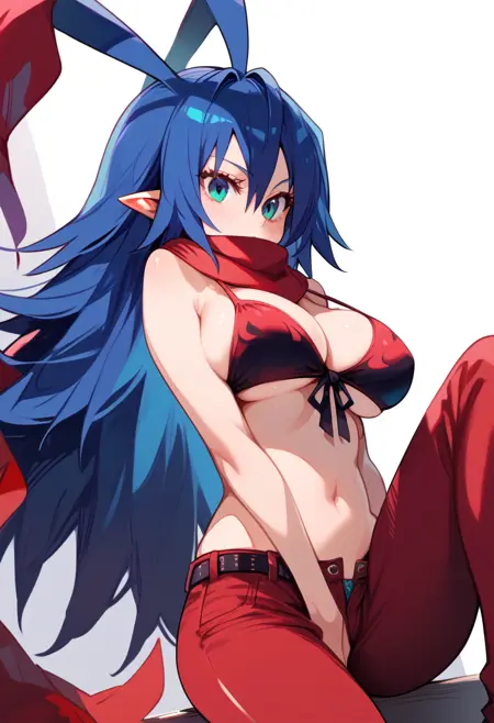 트리거: laharlchan, 파란 머리 여자, 긴 머리, 안테나 머리, 뾰족한 귀 여자, 큰 가슴, 스카프, 배꼽, 어깨 노출, 비키니 상의만, 바지