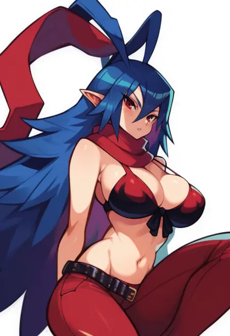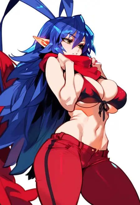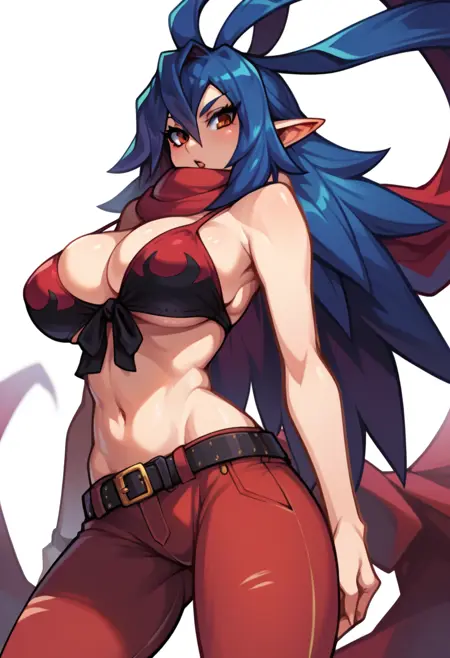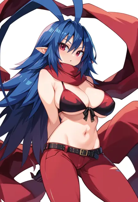 トリガー: laharlchan、青髪の女性、長い髪、アンテナ髪、尖った耳の女性、大きな胸、スカーフ、おへそ、肩出し、ビキニトップのみ、パンツ