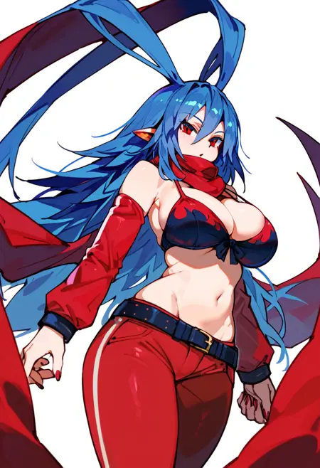 laharlchan, blue hair female, long hair, antenna hair, pointy ears female, large breasts, scarf, navel, bare shoulders, bikini top only, pants