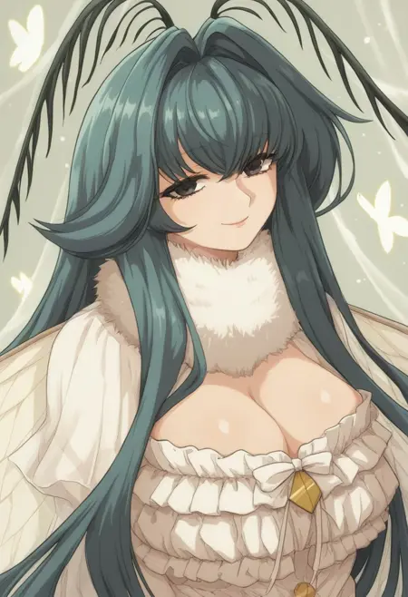 delirium silbyx, long hair, large breasts, white dress, cleavage, fur collar, bangs, antennae, wings, frills, arthropod girl, hair intakes,