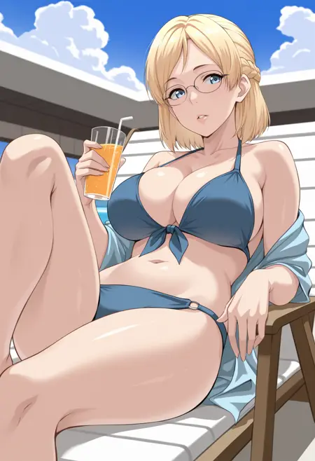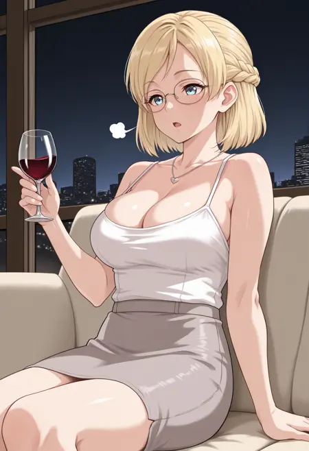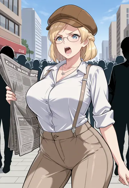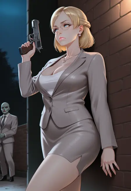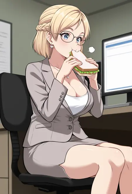 - 기본 외모: j3ssie, 금발, 단발, 프랑스식 땋은 머리, 안경, 파란 눈, 립스틱, 분홍색 입술, 하트 귀걸이, 하트 목걸이, 정장, 공식적인, 회색 재킷, 긴 소매, 큰 가슴, 젖가슴 노출, 흰색 캐미솔, 회색 치마, 연필 치마