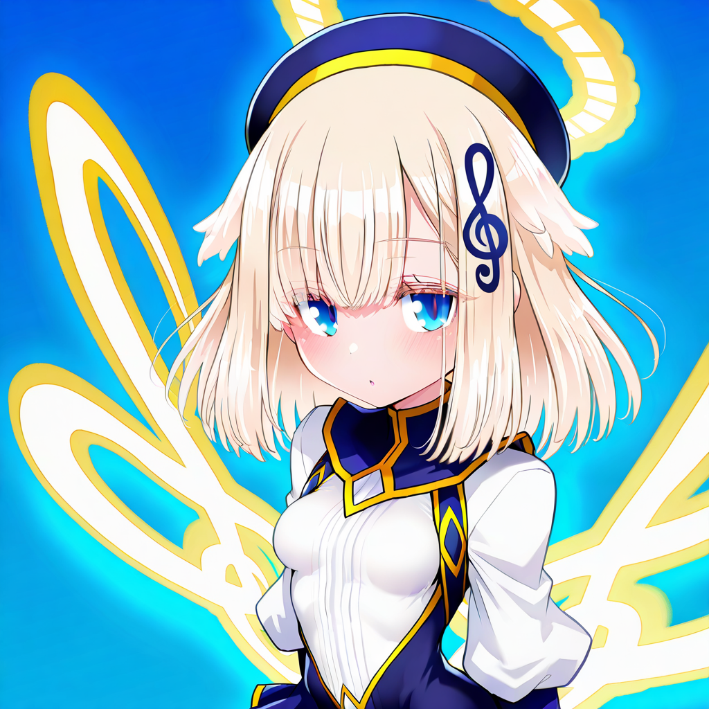 beret,white shirt,blue dress, halo,wings,hair ornament,