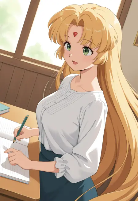 외모: 금발, 매우 긴 머리, 머리리본, 흰색 리본, 녹색 눈, 가슴