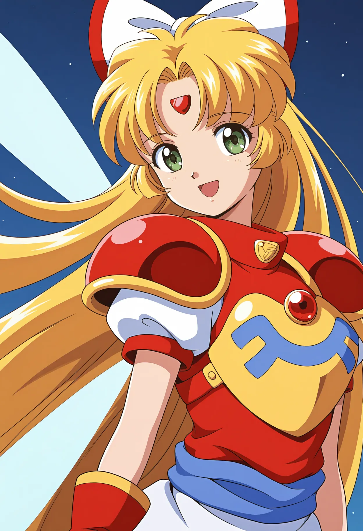 복장: 빨간 드레스, 어깨 갑옷, 파울드런, 짧은 소매, 빨간 장갑, 치마, 팬티스타킹, 허리 띠, 무릎 부츠, 빨간 신발