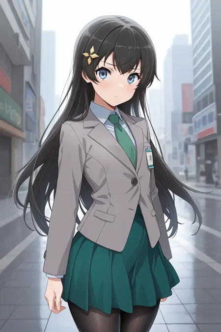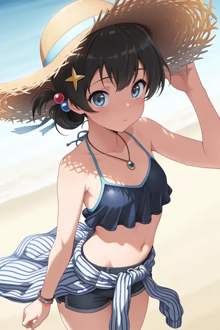 hikari, 1girl, long hair, skirt, solo, black hair, jacket on shoulders, jacket, yellow belt, blue skirt, pleated skirt, looking at viewer, stage outfit,