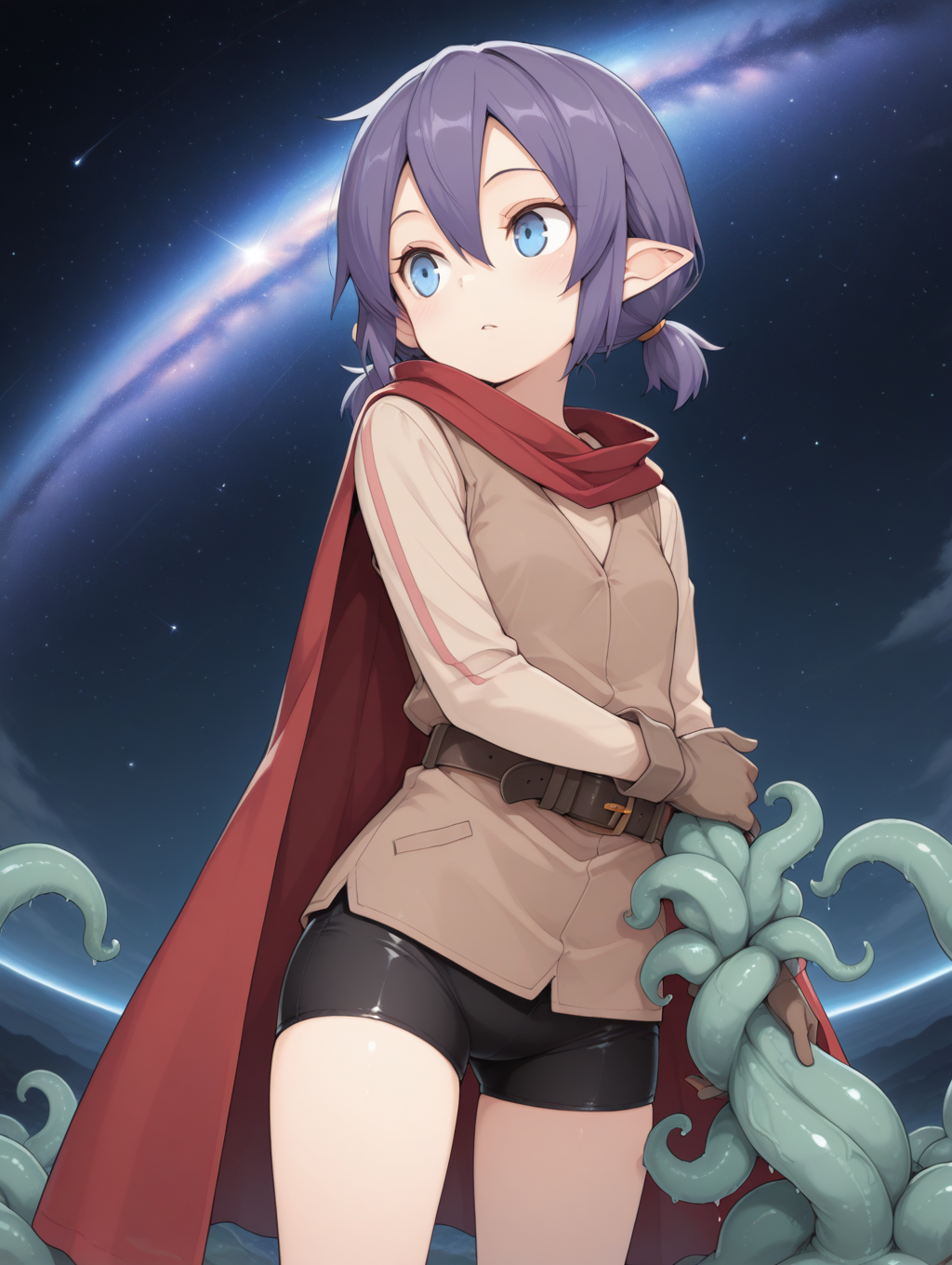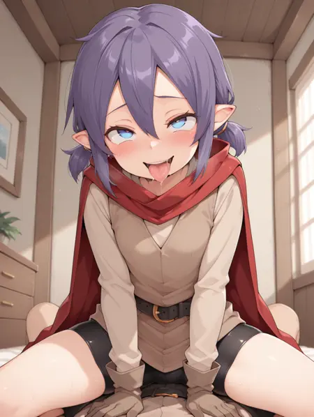 ドッペル、紫髪、短髪、低めのツインテール、目の間の髪、青い目、尖った耳、赤いマント、茶色のベスト、ベージュのシャツ、長袖、ベルト、黒いショートパンツ、バイクショーツ、手袋、