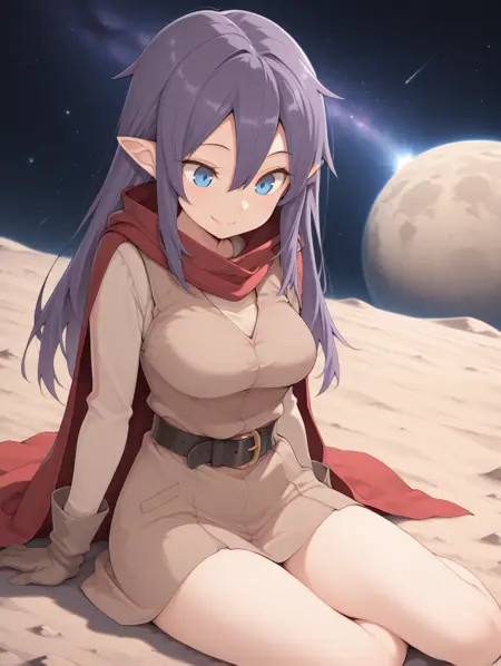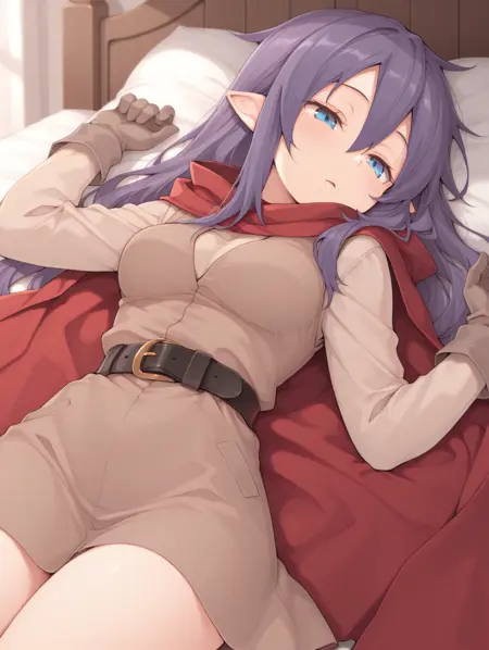 ドッペル、紫髪、長髪、目の間の髪、青い目、尖った耳、中くらいの胸、赤いマント、茶色のベスト、ベージュのシャツ、長袖、ベルト、手袋、茶色のドレス、