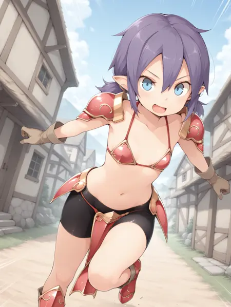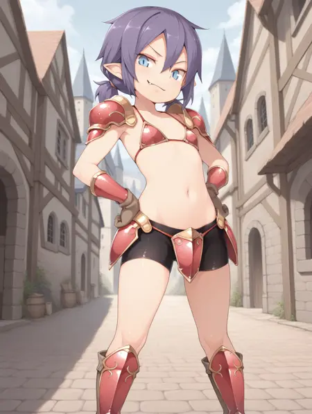 ドッペル、紫髪、短髪、低めのツインテール、目の間の髪、青い目、尖った耳、犬歯、鎧、ビキニアーマー、茶色の手袋、へそ、バイクショーツ、ブーツ、肩甲骨アーマー、パウドロン、股アーマー、