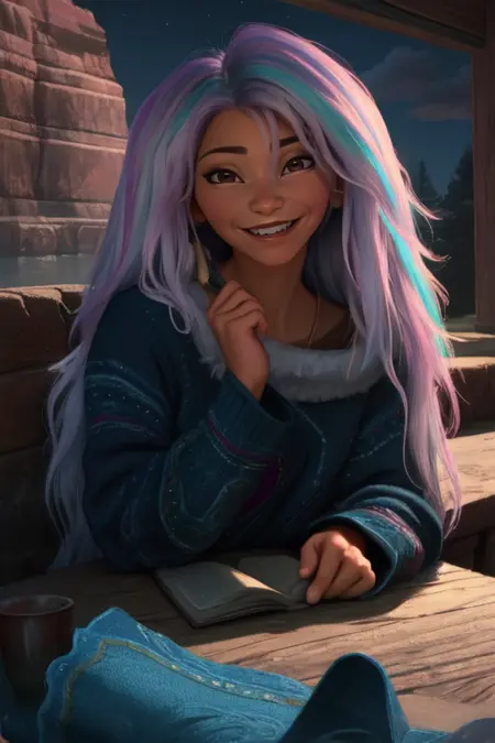 sisu, multicolored hair, black eyes, or dark purple eyes,