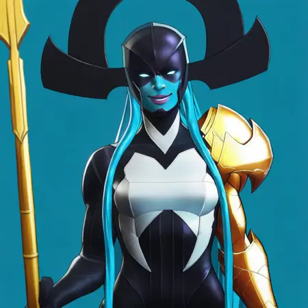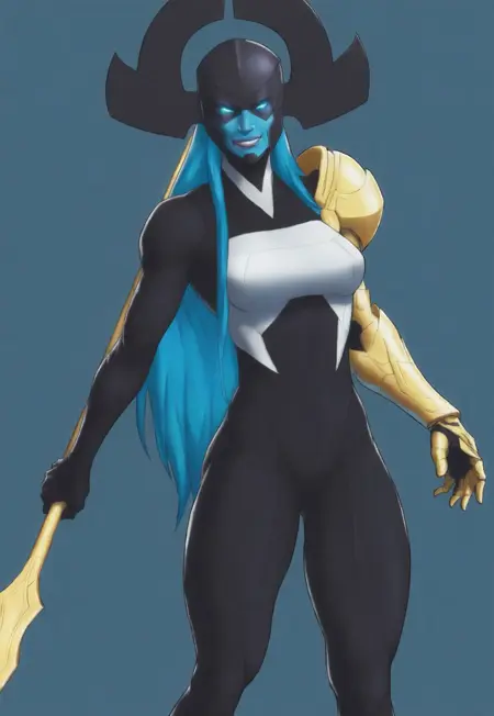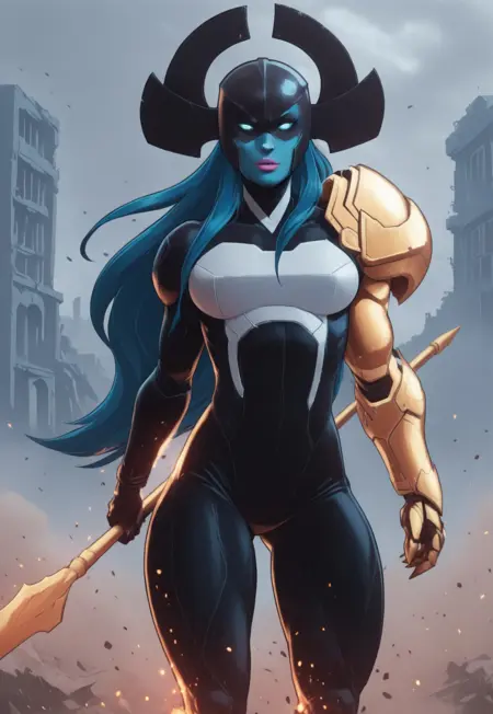 | Trained Words | 1girl, solo, medium breasts, toned female, wide hips, Marvel, ProximaMidnight, blue hair, long hair, extremely long hair, helmet, black headgear, covered hair, pink lips, Alien female, blue skin, blue-skinned female, colored skin, blue sclera, white pupils, glowing eyes, black bodysuit, white trim, Left arm, one armored arm, gold armor, shoulder armor,Copied! Optional: weapon, spear, gold spear, holding spearCopied! |