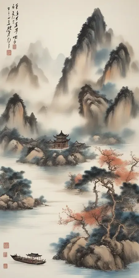 관련 프롬프트 키워드: mountain, waterfall, rock, boat, river, tree, ink-painting, chinese style