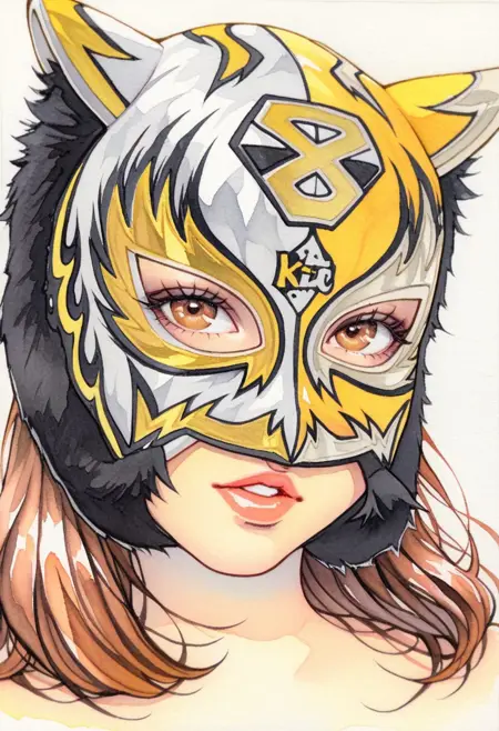 - masterpiece,best quality,amazing quality,starlikid++,starlikid, stkidmaskyellow, yellow gery colors, 1girl, solo, brown hair, brown eyes, traditional media, mask, portrait, looking at viewer, lips, parted lips, posing on wresting arena