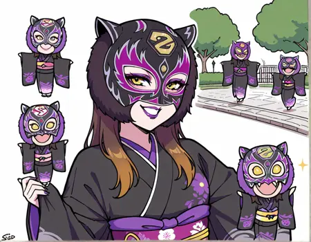 masterpiece,best quality,amazing quality,starlikid++, stkidmask standard, black purple colors, , 1girl, Japanese clothes, kimono, black kimono, yellow eyes, brown hair, smile, fighting mask, purple lips, animal ears, puppet, white background, makeup, posing on park+, dancing moves,