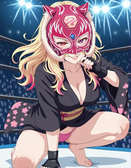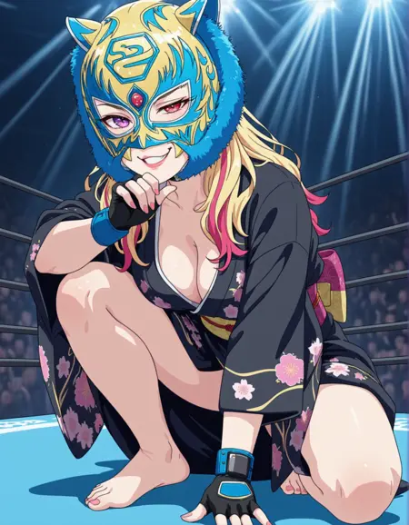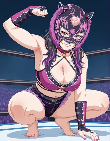masterpiece,best quality,amazing quality,starlikid++, (stkidmask standard)+, black purple colors, starouftit, 1girl, solo, nice hair, purple nails, looking at viewer, long hair, fighting mask, grey eyes, purple eyes , makeup, heterochromia, smile, lipstick, choker, nail polish, sitting on wresting arena++ , posing