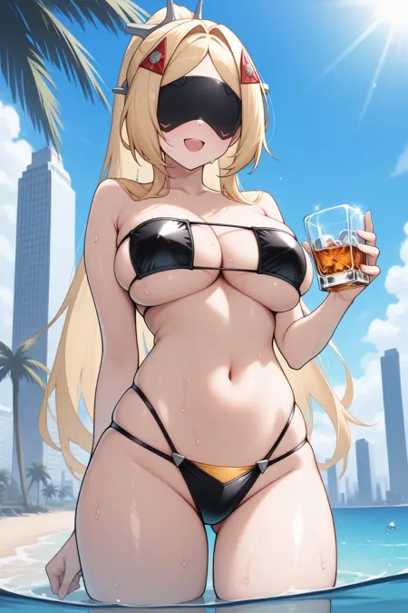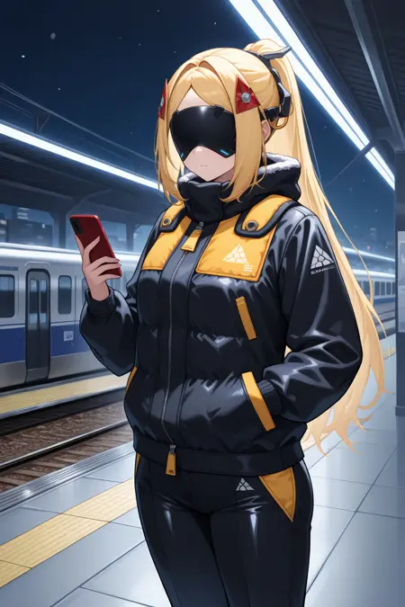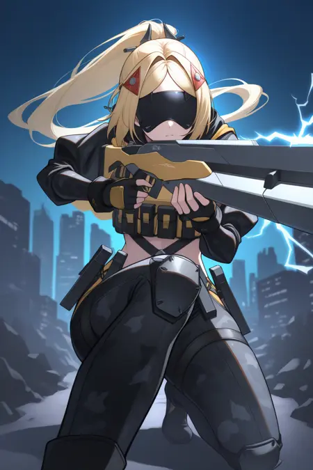 외모: tr1gg3r, 눈 가린 상태, 금발, 갈라진 앞머리, 머리카락이 흩어진 상태, 긴 머리, 포니테일, 삼각형 머리 장식, 헤드기어, 검은 눈가리개