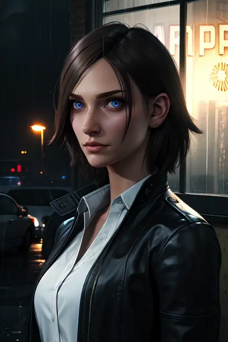 她的替代造型仅为白衬衫,无夹克,可能配有手枪腰带或背带,