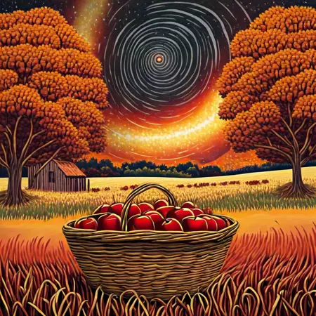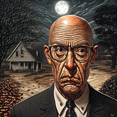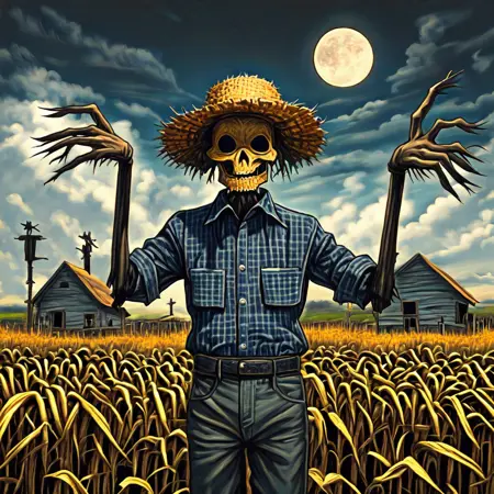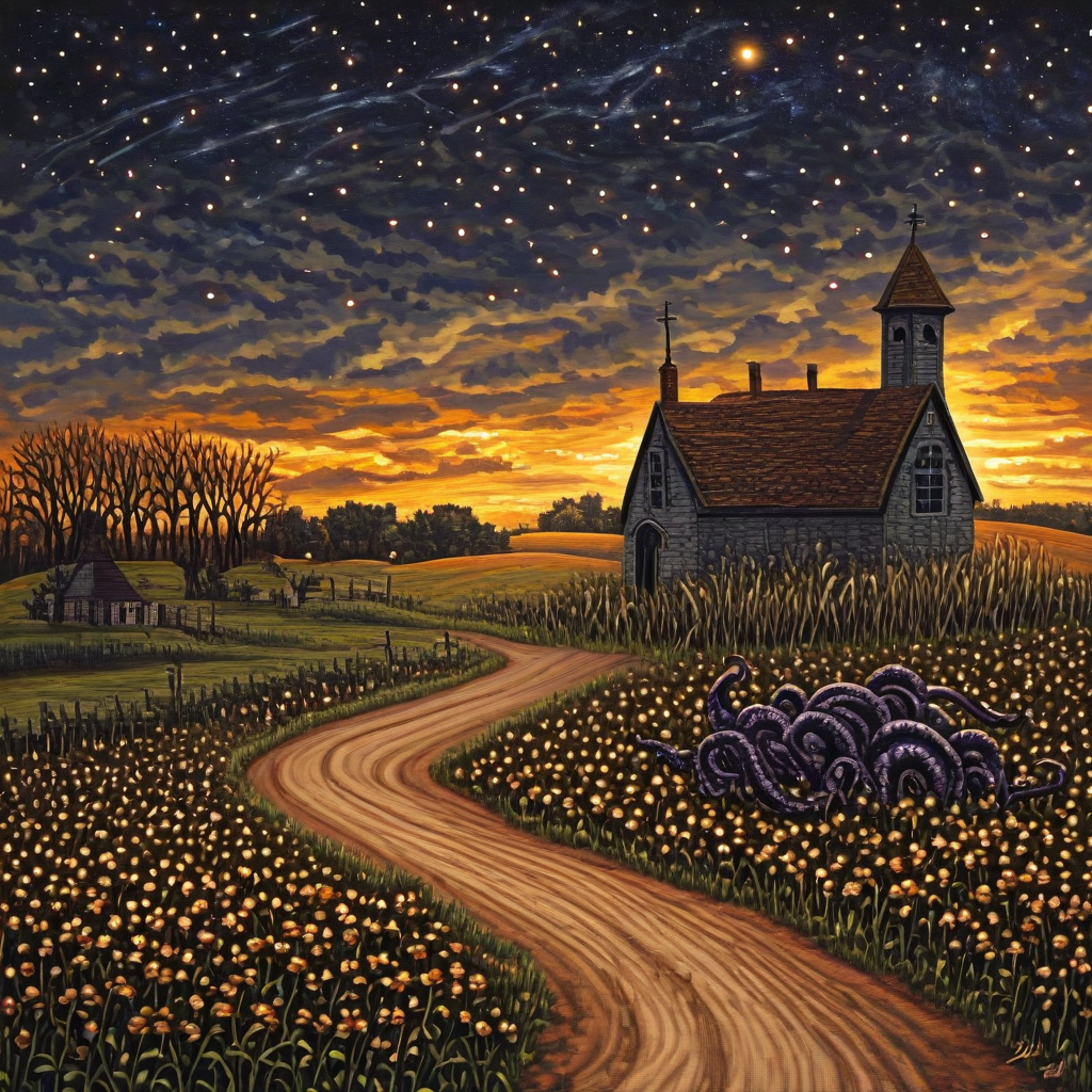 It combining detailed rural scenes, nostalgic Americana, and ominous supernatural elements. Inspired by Grant Wood, Thomas Hart Benton, and H.P. Lovecraft.